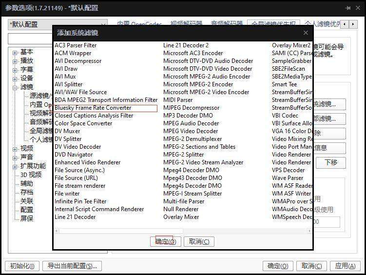 右键选择 选项>滤镜>全局滤镜优先权>添加系统镜像 选择 Bluesky frame rate converter